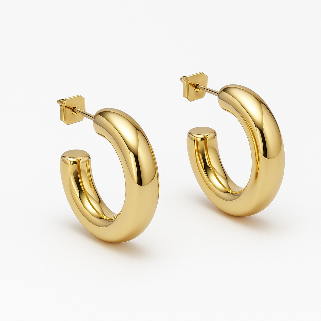 Close-up of a person with a gold chain necklace and Chubby Hoop 1.8 hoop earrings, touching their ear.