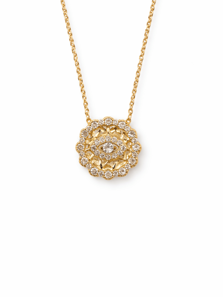 Our petite and delicate evil eye charm sits on a find gold chain. Soft, subtle and striking. Our only evil eye disc in our collection with clear diamante stones set on a textured disc.