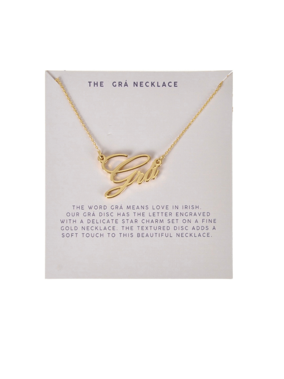 The word Grá means Love in Irish. A script style font set on a delicate gold chain and mounted on our quote card.