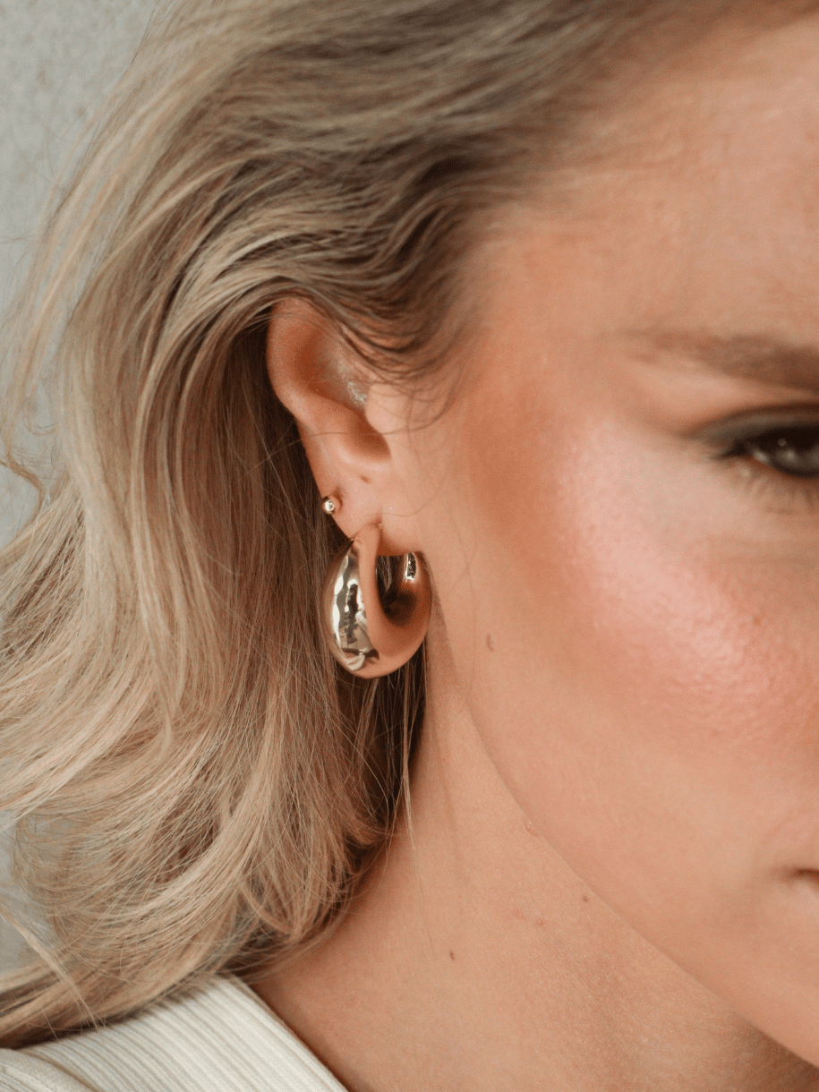 Sculptural and striking, the Demi Dome Gold Hoops bring a fresh twist to a classic silhouette. With their bold, curved shape and glossy gold finish, these hoops add a touch of artistic elegance to your everyday rotation. The fluid, crescent-like design creates a soft yet powerful statement.