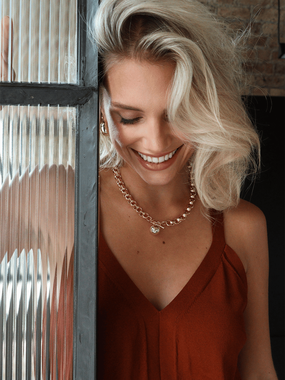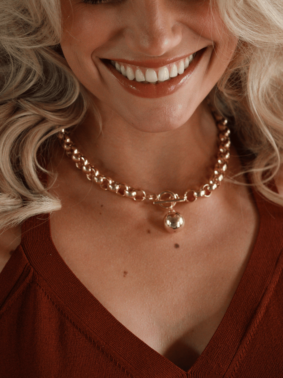 A new way to add your chunky layer. Our classic rolo link chain has been elevated to a t bar for a statement layering piece.