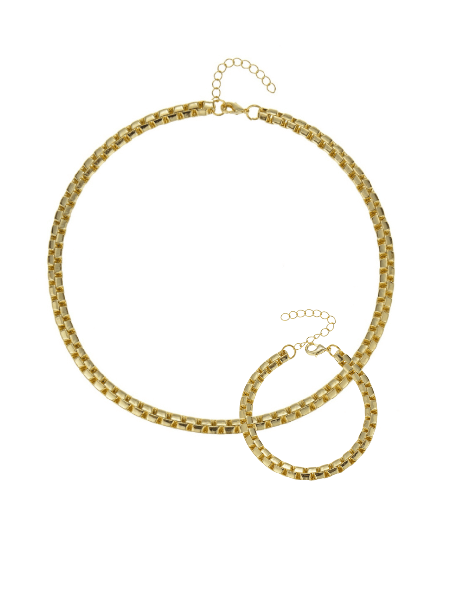 A flat block style layering chain with interwoven sections to create a perfect layering chain and matching bracelet set.