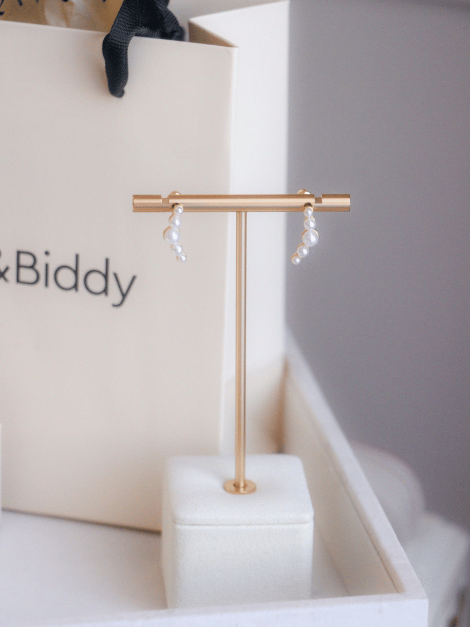 Une boucle d'oreille barre ornée de perles. Une rangée de perles sur une base dorée délicate apporte une touche de subtilité à votre mariage. À porter en ligne ou en pendant.