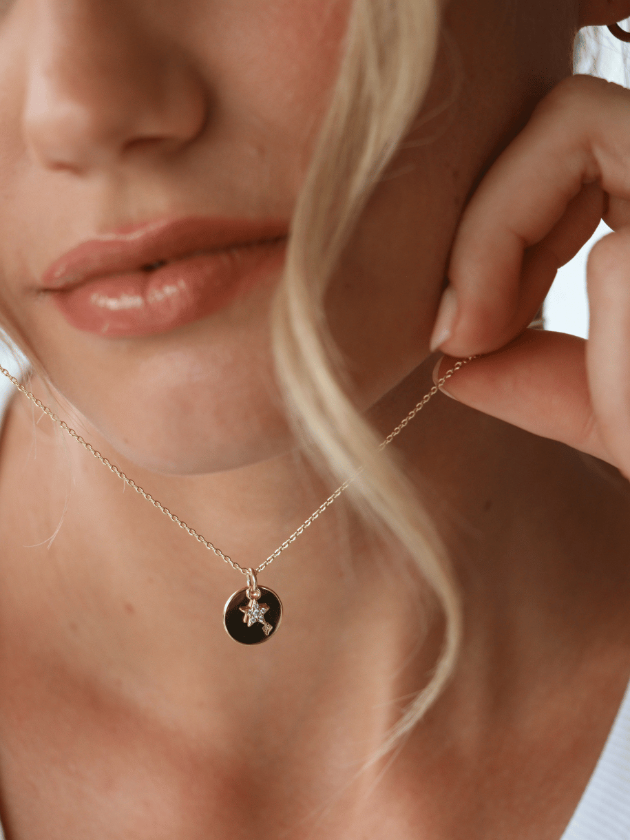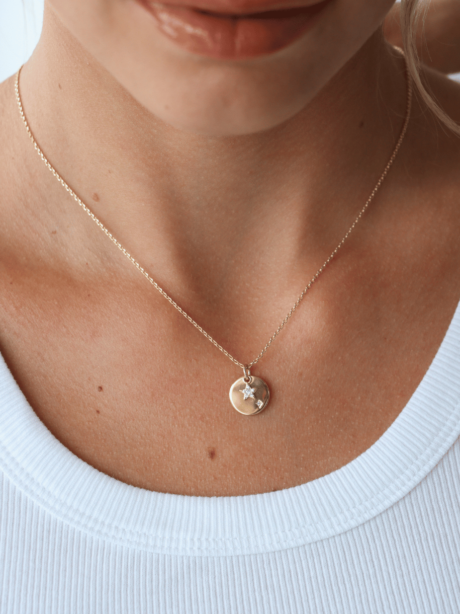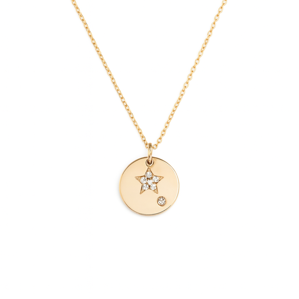 Een delicaat bedeltje in de vorm van een klein gouden schijfje.