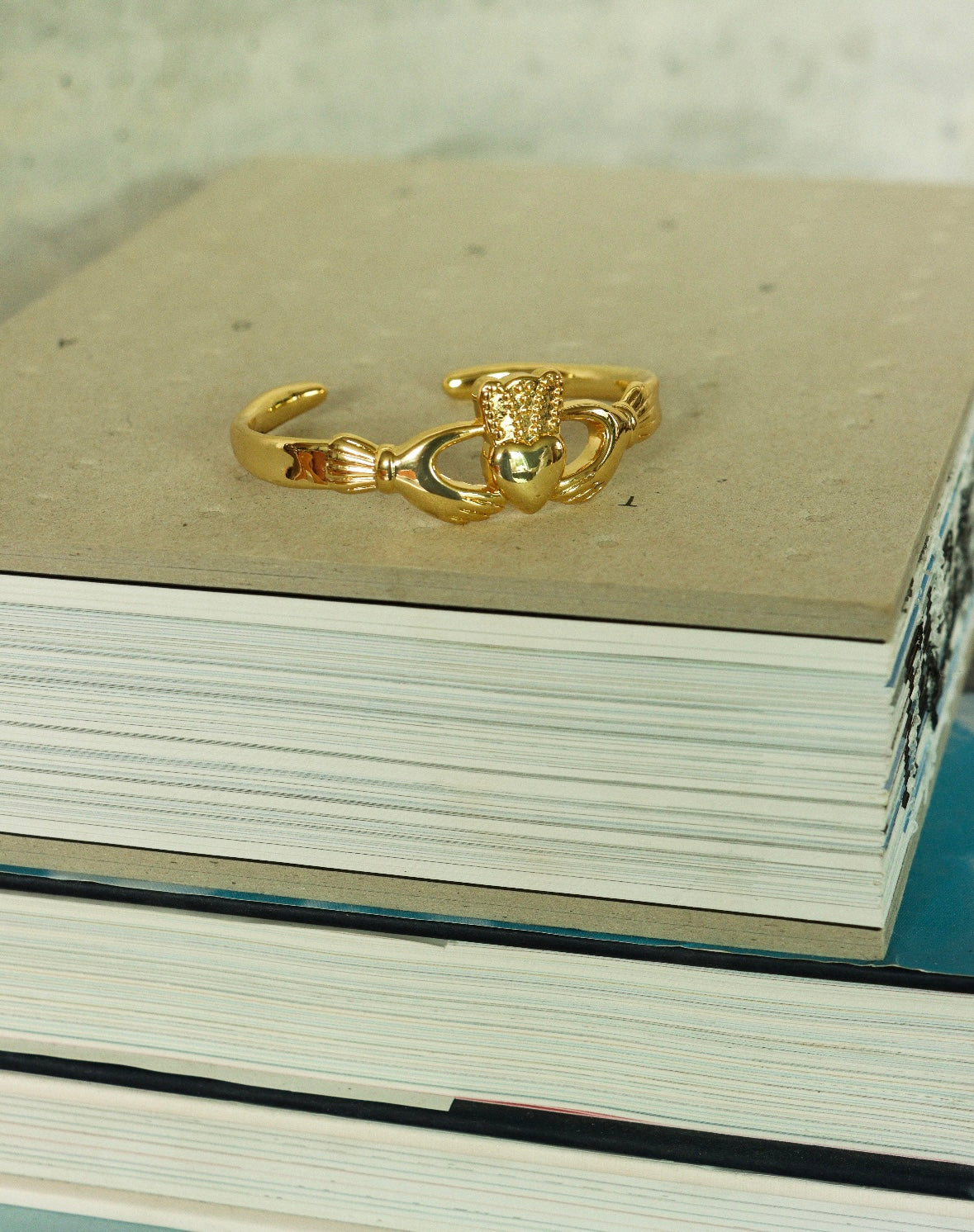 Een Claddagh-bangle in blokstijl, gedurfd en opvallend. Het Claddagh-symbool is gezet op een dikke gouden bangle.