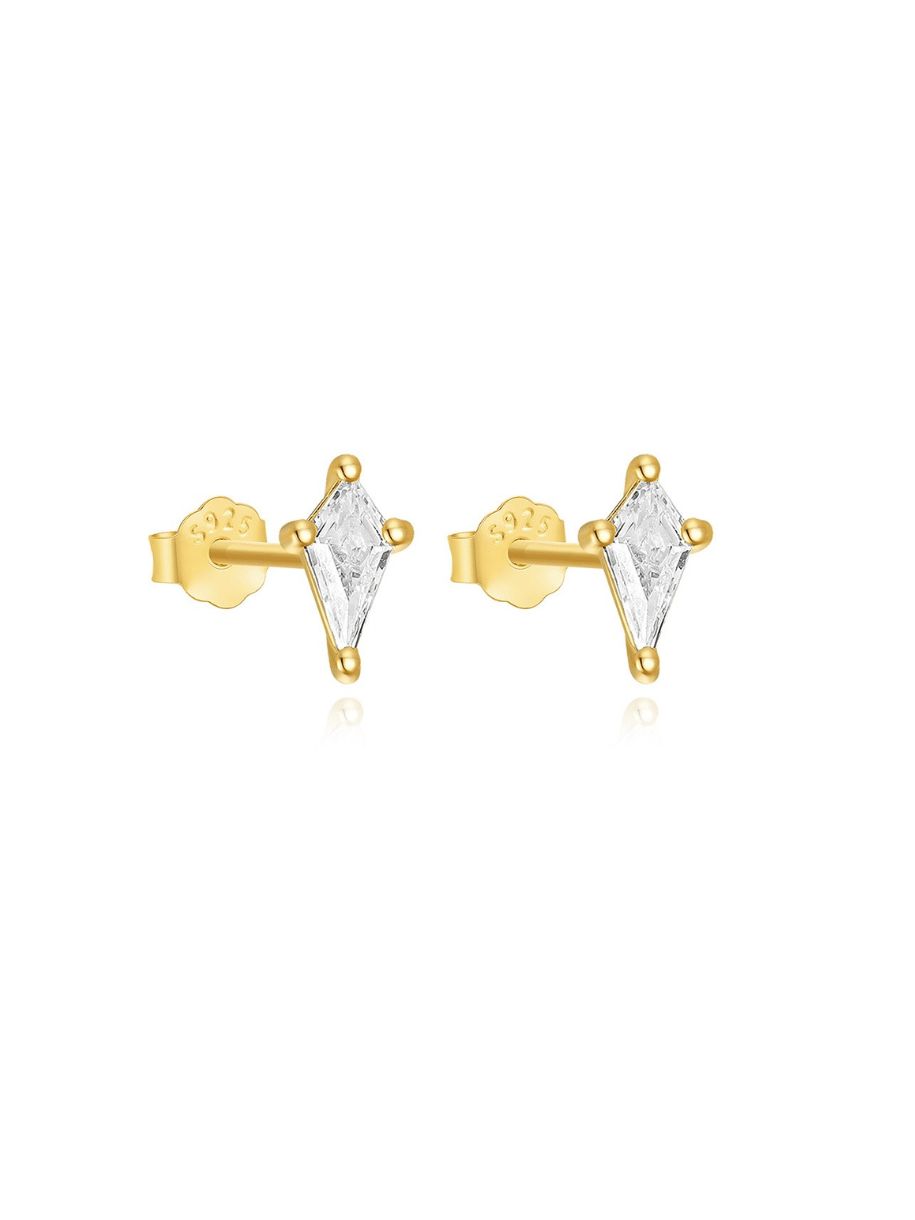 Een drievoudige reeks heldere edelstenen, op elkaar gestapeld met een gouden randje. De drie grote stenen vormen een reeks die samen een fijne en delicate oorsteker vormen.